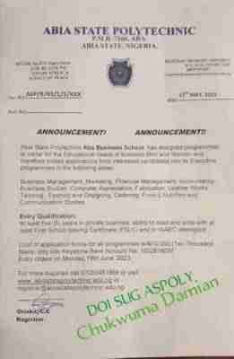 For more enquiries call 07050451869 or visit www.abiastatepolytechnic.edu.ng or [email protected].