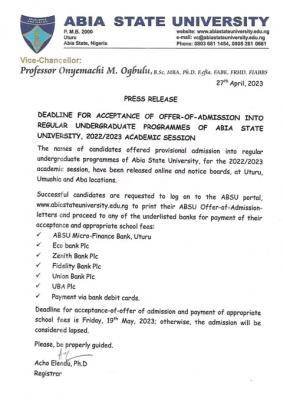 The names of candidates offered provisional admission into regular undergraduate programmes of Abia State University, 2022/2023 Academic Session, have been released Online and Notice board, at Uturu, Umuahia and Aba locations.