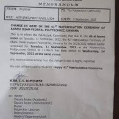This is to inform the Polytechnic Community that due to the sit-at-home order on Tuesday, 13 September, 2022, the 41st Matriculation Ceremony of Akanu Ibiam Federal Polytechnic, Unwana for the 2021/2022 session earlier scheduled for Tuesday, 13 September, 2022 at the Polytechnic’s Multipurpose Centre at 11.00a.m has been shifted to Wednesday, 14 September, 2022 at the same venue.