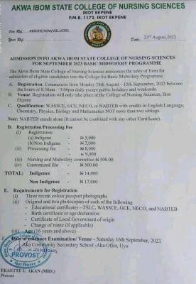 The Akwa Ibom State College of Nursing Sciences has announced the sales of form for admission of eligible candidates into the College for Basic Midwifery Programme.