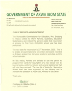 The Honourable Commissioner for Education, Mrs. Enobong U. Mbobo wishes to inform Parents, Guardians, Education Stakeholders, and indeed the general public that the resumption of schools for the First Term 2020/2021 school year has been postponed.