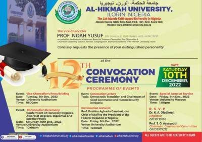 The Vice-Chancellor of the Al-Hikmah University, Ilorin, Kwara State, Prof. Noah Yusuf, on behalf of the Council, Senate, and Congregation, cordially invites your distinguished presence to the 12th Convocation Ceremony.