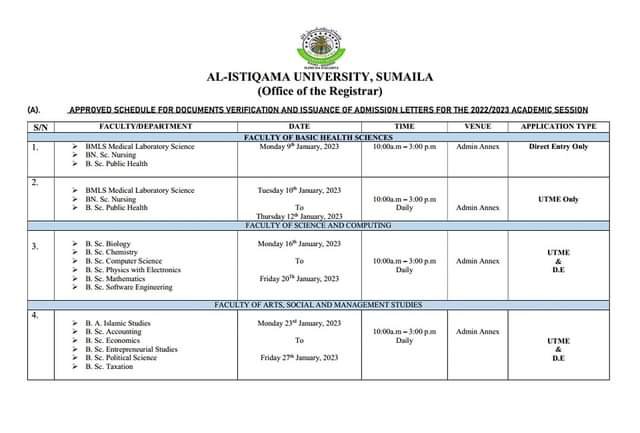 The management of Al-Istiqama University has relaesed the schedule for documents verification and issuance of Admission letters for the 2022/2023 academic session.