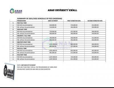 ANAN University Postgraduate School Fees Schedule for 2021/2022 Session