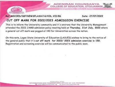 On this note, Lagos State University of Education (LASUED) wishes to bring to the notice of the general public that it’s cut off mark for 2022/ 2023 admission exercise is 150.