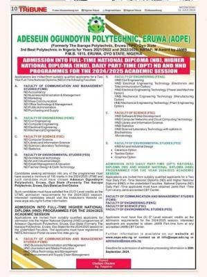 Applications are invited from suitably qualified applicants for admission into the Higher National Diploma (HND) programmes of Adeseun Ogundoyin Polytechnic, Eruwa, Oyo State (Formerly The Ibarapa Polytechnic, Eruwa, Oyo State) for the 2024/2025 session in the underlisted Faculties. The applicants must have registered on NBTE Admission Portal via http://www.hnd.nbte.gov.ng.