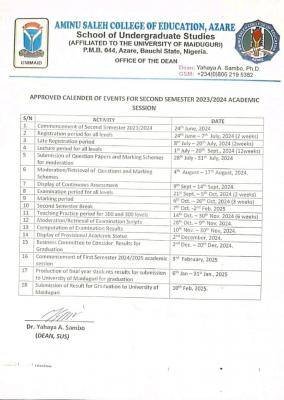 Management of the Aminu Saleh College of Education, Azare in affiliation with University of Maiduguri has released the approved academic calendar for the second semester of school of undergraduate studies for the 2023/2024 academic session.