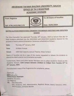 We are pleased to notify all the newly admitted students of the Abubakar Tafawa Balewa University (ATBU), Bauchi for the 2022/2023 and 2023/2024 academic sessions that the management of the university has announced the date for the orientation programme.