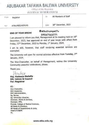 ATBU Resumption Date: This is to inform all staff and students of the Abubakar Tafawa Balewa University that the Management as its meeting held on 18th December, 2023, has approved an end of the year break with effect from Friday, 22nd December, 2023 to Monday, 1st January, 2024. Staff rendering essential services are exempted. The University will open for normal academic activities effective from Tuesday, 2nd January, 2024.