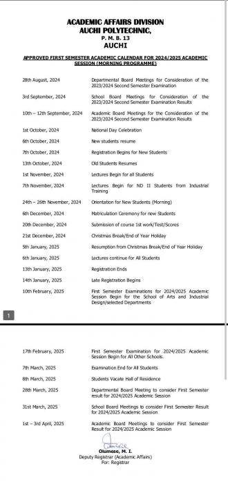 Auchi Poly Academic Calendar Published: The Auchi polytechnic Academic Calendar for the 2024/2025 academic session has been published. The Academic Calendar contains a break down of academic activities of the 2024/2025 academic session.
