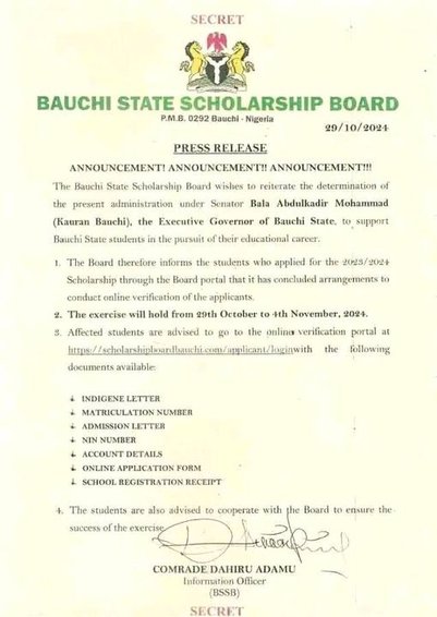 Bauchi State Scholarship Board Announces Verification Exercise for 2023/2024 Applicants