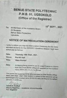 Benue State Polytechnic, BENPOLY matriculation ceremony exercise for newly admitted students of the 2020/2021 academic session has been announced. See details below.