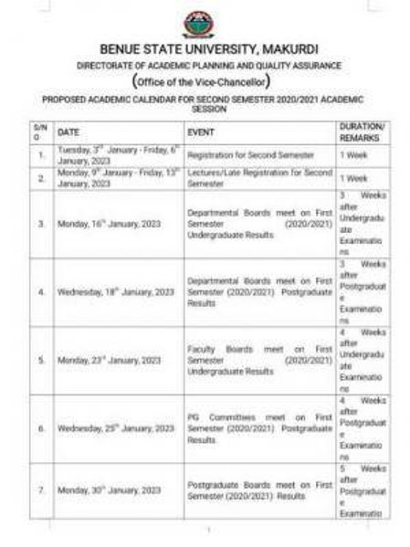 BSU Academic Calendar: This is to announce to all the students of the Benue State University, Makurdi (BSUM) that the management of the institution has released the academic calendar for the second semester, 2020/2021 academic session.