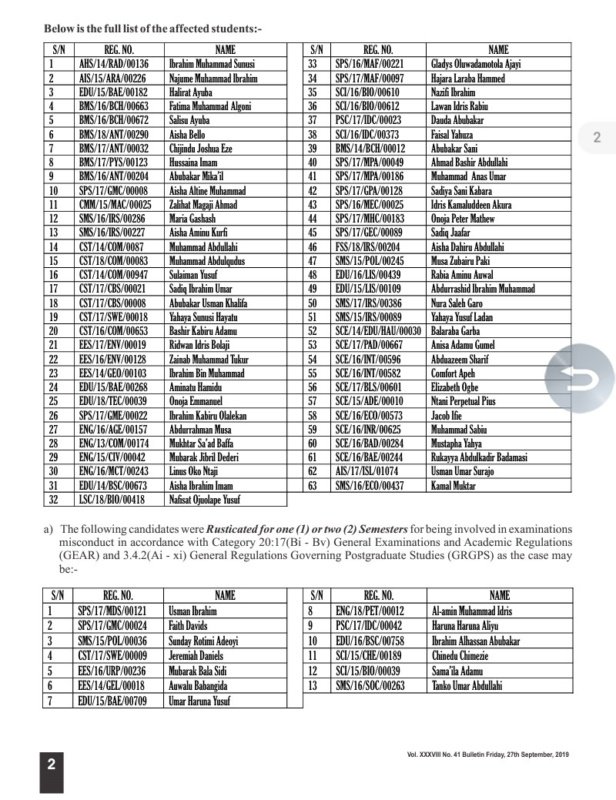 The Bayero University, Kano has expelled 63 students and rusticated 13 others for one year for their involvement in various forms of examination misconduct.