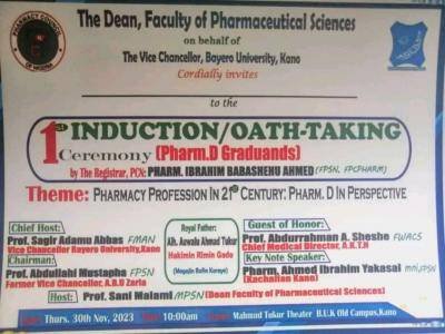 The Dean, Faculty of Pharmaceutical Sciences on behalf of The Vice Chancellor, Bayero University, Kano Cordially invites to the first induction and oath taking ceremony of the Pharmacy graduands which is scheduled to hold as follows: