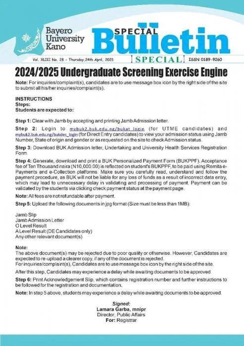 BUK Screening Exercise For Newly Admitted Students: This is to notify all students who were admitted by Bayero University Kano (BUK) that the screening exercise has commenced.