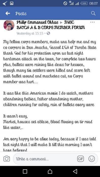 “My fellow corps members, make una help me and my co corpers in Dan Anacha, Gassol LGA of Taraba State thank God for his protection upon us last night herdsmen attack on the town, for complete two hours plus, bullets were raining like dews for heaven, though many tiv settlers were killed and score left with bullet wound and machetes cut, no Corps member was hurt….