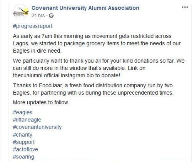 The Alumni of Covenant University has taken upon itself to provide food stuff for her students following the shutdown in the midst of the Covid-19 crisis. The pictures were shared on their facebook platform by the admin