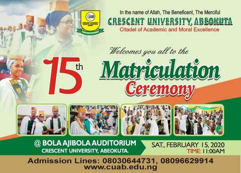 Crescent University 15th Matriculation Ceremony will hold as follows: