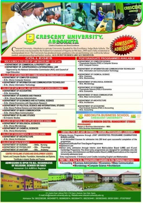 2. Interested candidates who did not make Crescent University Abeokuta their choice in JAMB but scored minimum acceptable marks of 160 and above can also apply, but must do change of institution to Crescent as first choice at any CBT centre.