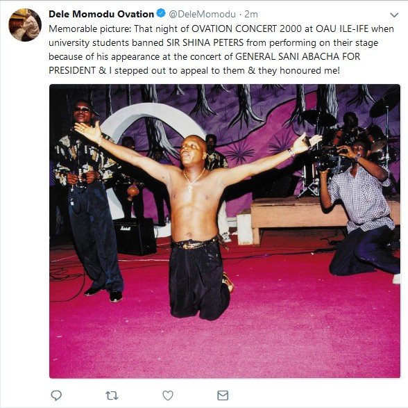 From social media, as shared by Dele Momodu: Memorable picture: That night of OVATION CONCERT 2000 at OAU ILE-IFE when university students banned SIR SHINA PETERS from performing on their stage because of his appearance at the concert of GENERAL SANI ABACHA FOR PRESIDENT & I stepped out to appeal to them & they honoured …