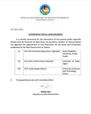 It is hereby announced for the information of the general public especially Deltans that the Governor of Delta State, His Excellency, Senator, Dr. Ifeanyi Okowa has approved the appointment of Vice-Chancellors for the three new Universities established by the State Government as follows: