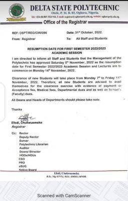 Delta Poly Otefe-Oghara Resumption: This is to inform all Staff and Students that the Management of the Delta State Polytechnic, Otefe-Oghara has approved Saturday 5 November, 2022 as the resumption date for First Semester 2022/2023 Academic Session and Lectures are to commence on Monday 14th November, 2022.
