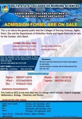 This is to inform the general public that the Colleges of Nursing Sciences, Agbor, Warri, Eku and the Department of Midwifery Asaba and Sapele forms are now on sale for the October, 2023 Batch.
