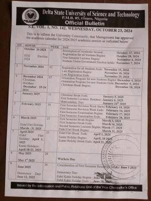 Management of the Delta State University of Science and Technology (DSUST) wishes to inform the general public and the University Community of the newly approved academic calendar for 2024/2025 session.