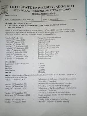 Management of the Ekiti State University (EKSU) has released the academic calendar for the first-year students, first semester in the 2020/2021 academic session. The break down of academic activities is as indicated below;