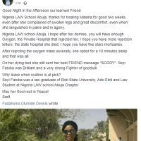 A student of the Nigeria law school law and a graduate of Ekiti State University (EKSU), Seyi Fatoba, died after being on treatment for Malaria fever. The deceases said to have complained of “swollen legs and great discomfort” at the hospital where she was being treated. The malaria treatment was said to have been continued …