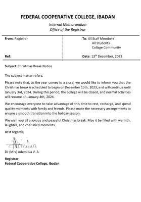 The management of the Federal Cooperative College (FCC), Ibadan has announced the break for the Christmas and New Year holidays, as well as the resumption date for continuation of academic activities. The notice as released by the university’s management is as follows;