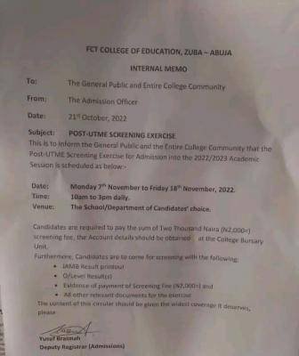 FCT College of Education Post-UTME Screening Date, 2022/2023
