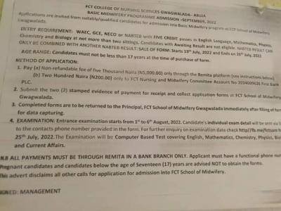 Application is invited from suitable/qualified candidates for admission into the Basic Midwifery programme at FCT School of Midwifery Gwagwalada.