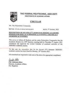 Fed Poly Ado-Ekiti Resumption Date for 2nd Semester, 2020/2021 Session