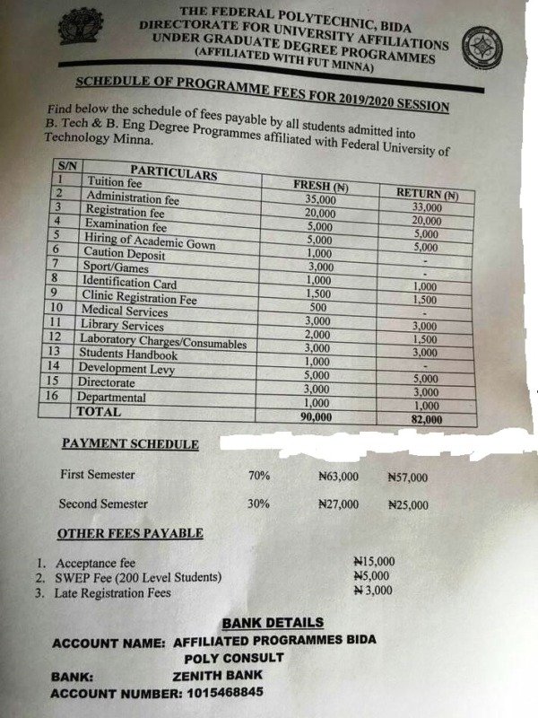Fed Poly Bida Degree School Fees: This is to inform the general public that the management of the Federal Polytechnic Bida in affiliation with the Federal University of Technology Minna (FUMTINNA) has released the school fees payable by students undergoing degree programmes in the institution for the 2019/2020 academic session.