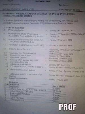 The Academic Board at its 201st Emergency Meeting held on Wednesday 22nd February 2023 amended the approved academic calendar for the 2022/2023 academic session.