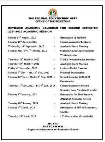 The Academic Board of the Federal Polytechnic, Offa (OFFAPOLY) has reviewed the academic calendar for the second semester, 2021/2022 academic session.