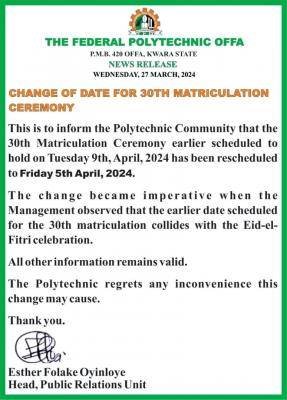 This is to inform the Polytechnic Community that the 30th Matriculation Ceremony earlier scheduled to hold on Tuesday 9th, April, 2024 has been rescheduled to Friday 5th April, 2024.