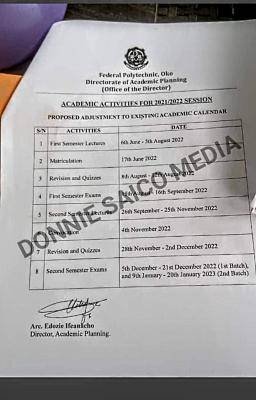 This is to inform Students of federal Polytechnic Oko that the management has released the Adjusted Academic Calendar for 2021/2022 session.