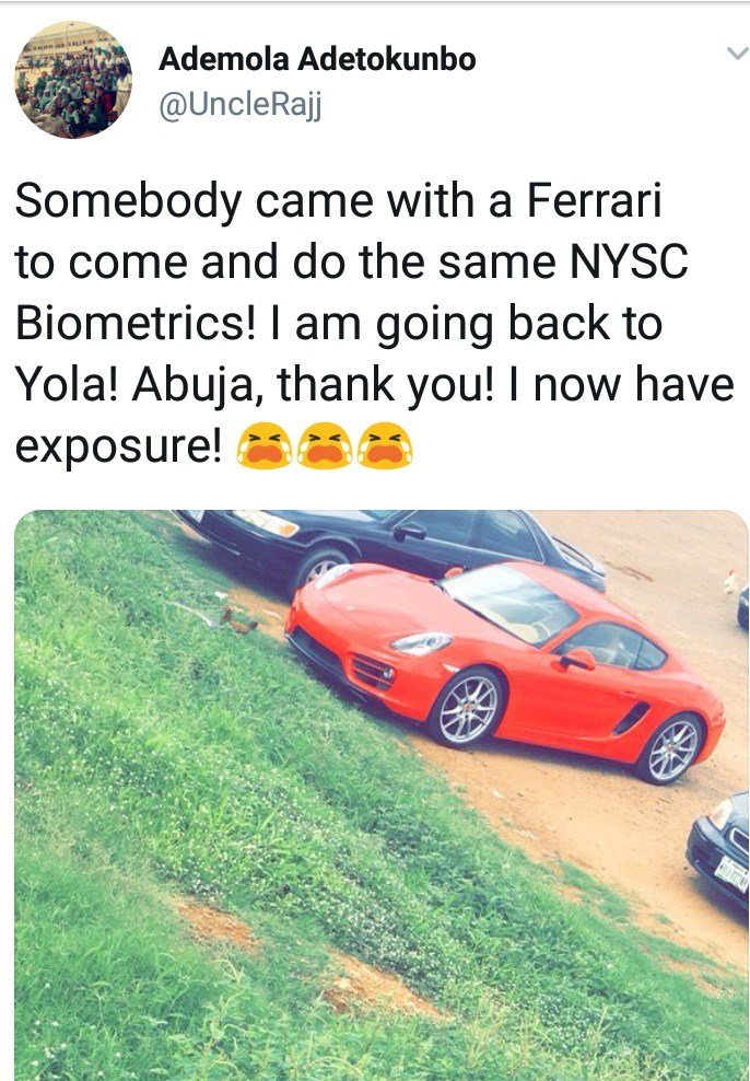 “Somebody came with this to come and do the same NYSC Biometrics! I am going back to Yola! Abuja, thank you! I now have exposure! ”