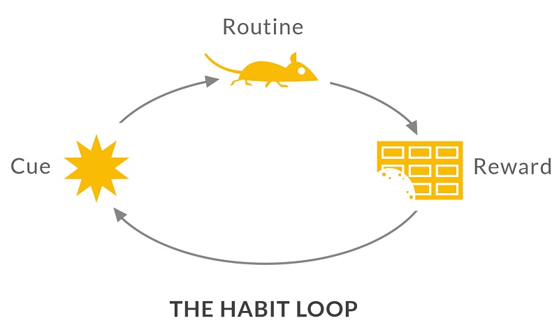 According to Charles Duhigg, every habit functions much the same way. At first, there’s a CUE , which is some type of trigger that makes the behaviour unfold automatically and studies tell us that a cue can be a location, a time of day, a certain emotional state or feeling, other people or just a pattern of behaviours that consistently triggers a certain ROUTINE. See the habit loop below: