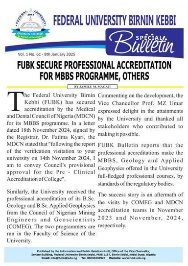 The Federal University Birnin-Kebbi (FUBK) has secured accreditation by the Medical and Dental Council of Nigeria (MDCN) for its MBBS programme.
