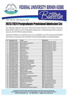 The management of the Federal University Birnin Kebbi (FUBK) has released the list of candidates offered provisional admission into various postgraduate programmes for the 2023/2024 academic session.