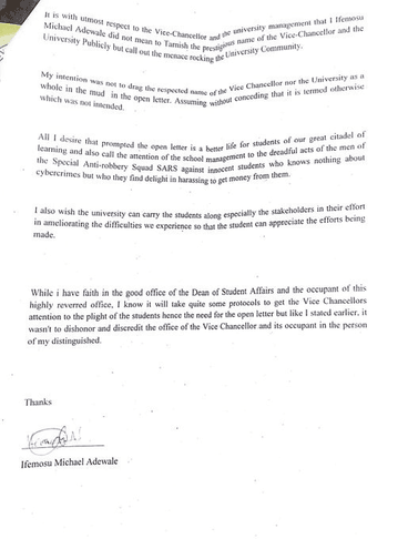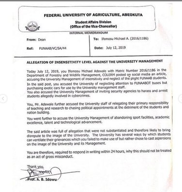 A student of the Federal University of Agriculture Abeokuta (FUNAAB) identified as Ifemosu Michael has reportedly been expelled over his post on insecurity and police harassment in the school. In a letter that conveyed the message of his expulsion, Ifemosu was accused of raising allegations and misrepresenting facts about the institution.