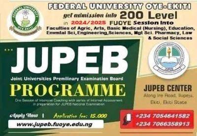 JUPEB is a national examination board approved by the Federal Government to conduct examinations for students with approved subject combinations for direct entry admissions into tertiary institutions. Candidates would be admitted to 200 level in Federal University Oye Ekiti or any other university that is affiliated to the JUPEB programme after fulfilling the conditions for admission as required by FUOYE or any other university of their choice. At the end of the programme certificates of Direct Entry, admission would be issued to the students. Please visit jupeb.edu.ng for further information.