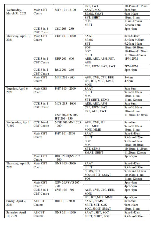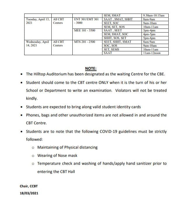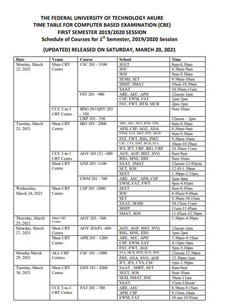 Management of the Federal University of Technology, Akure (FUTA) has released the Computer Based Examination (CBE) timetable for the first semester, 2019/2020 academic session.