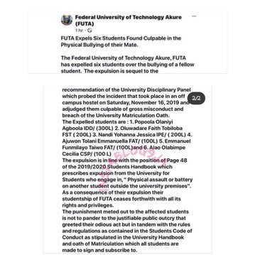 The management of the Federal University of Technology Akure (FUTA), have expelled 6 students of the institution caught on camera early this month assaulting a fellow student. The incident caused a national uproar as many internet users called for the expulsion of the students involved in the act.