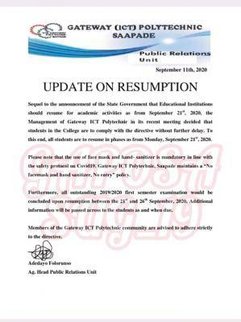 Following the announcement of the State Government that educational institutions should resume for academic activities as from September,21st,2020 the management of Gateway ICT Polytechnic in its recent meeting decided that students in the college are to comply with the directive without further delay to this end students all students are to resume in phase as from Monday 21st of September, 2020.