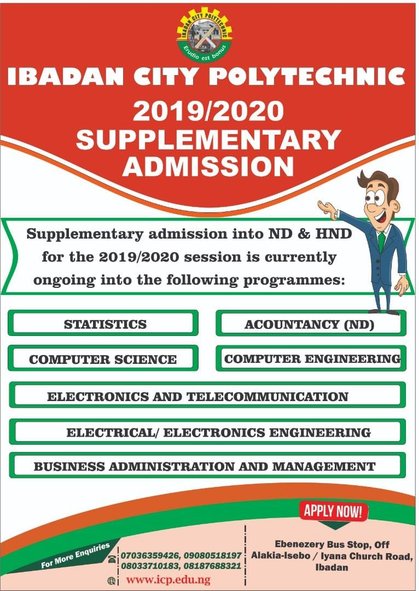 The supplementary admission into National Diploma (ND) and Higher National Diploma (HND) full-time/part-time programmes of Ibadan City Polytechnic (ICP) for the 2019/2020 academic session, is currently ongoing.